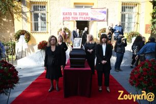 Η σορός του Αλέκου Φλαμπουράρη έφτασε στο Πάρκο Ελευθερίας στις 13:30, με τη σύζυγο του πρώην Υπουργού Επικρατείας, Εύη Φλαμπουράρη, να ξεσπά σε λυγμούς πάνω από το φέρετρο του συζύγου της.