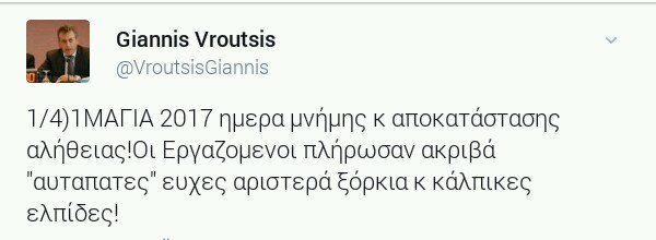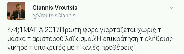 Καταλήγοντας τόνισε: «Πρωτομαγιά 2017. Πρώτη φορά γιορτάζεται χωρίς τη μάσκα του αριστερού λαϊκισμού! Η επικράτηση της αλήθειας, νίκησε τους υποκριτές με τις «καλές προθέσεις»!…
