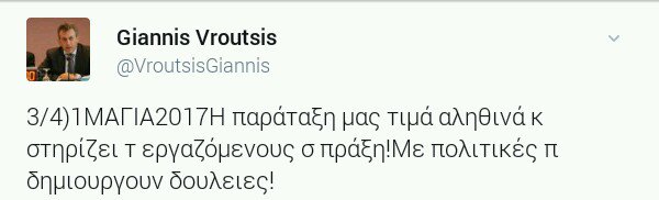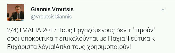 Στέλνοντας το δικό του, μήνυμα και αποτυπώνοντας τη σημερινή πραγματικότητα, στην αγορά εργασίας, ο πρώην Υπουργός, έγραψε: «Πρωτομαγιά 1017. Ημέρα μνήμης και αποκατάστασης της αλήθειας! Οι εργαζόμενοι πλήρωσαν ακριβά «αυταπάτες», ευχές, αριστερά ξόρκια και κάλπικες ελπίδες», ενώ χρησιμοποιώντας «αυστηρή γλώσσα» είπε: «Τους εργαζόμενους δεν τους «τιμούν» όσοι υποκριτικά τους επικαλούνται με παχιά – ψεύτικα και ευχάριστα λόγια! Απλά τους χρησιμοποιούν».