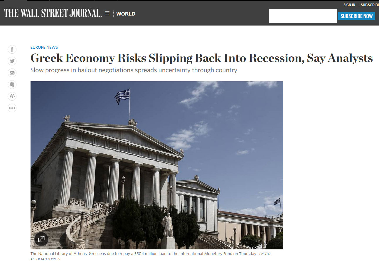 Οι τελευταίες υποσχέσεις της Ελλάδας ότι θα αποπληρώσει τους πιστωτές της έχουν μειώσει τις ανησυχίες για επικείμενη χρεοκοπία της χώρας, ωστόσο με την κυβέρνηση να διαθέτει μόνο τα απαραίτητα, η ελληνική οικονομία διολισθαίνει πίσω στην ύφεση, αναφέρει σε δημοσίευμά της τη Δευτέρα η Wall Street Journal.