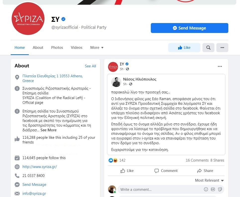 Στο «στόχαστρο» χάκερ από την Ινδονησία μπήκε η επίσημη σελίδα του ΣΥΡΙΖΑ-Προοδευτική Συμμαχία στο Facebook, με αποτέλεσμα τις τελευταίες ώρες, το όνομα της σελίδας του κόμματος της αξιωματικής αντιπολίτευσης στο δημοφιλές social media να έχει αλλάξει σε σκέτο «ΣΥ».