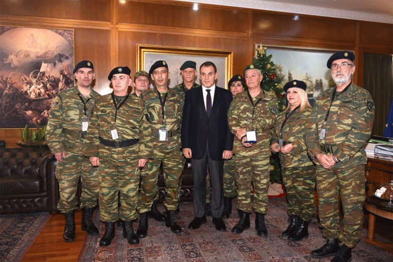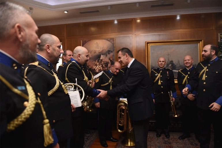 Τα χριστουγεννιάτικα κάλαντα έψαλαν στην πολιτική και στρατιωτική ηγεσία του υπουργείου Εθνικής Άμυνας η μικτή μπάντα των Ενόπλων Δυνάμεων στην κεντρική είσοδο του υπουργείου.