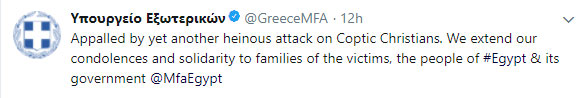 Τον αποτροπιασμό του εκφράζει το υπουργείο Εξωτερικών με ανάρτησή του στο Twitter, στην αγγλική γλώσσα, για την «απάνθρωπη επίθεση εναντίον των Κοπτών Χριστιανών».