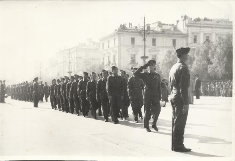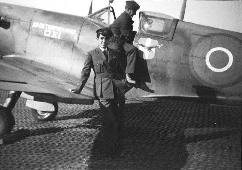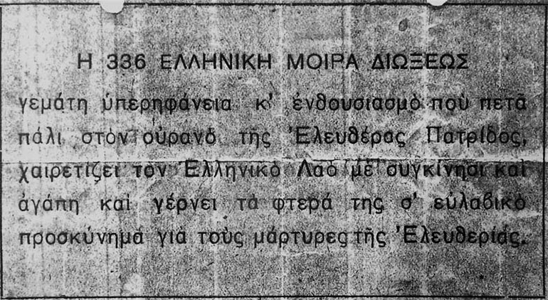«Οι τρεις Μοίρες, (σ.σ. 13η, 335η και η 336η) ένα σύνολο από καμιά εβδομηνταριά αεροπλάνα (Spitfire και Baltimore) ξεκίνησαν ταυτόχρονα, η μια πίσω από την άλλη, πέρασαν το Ιόνιο και μέσω Κεφαλονιάς-Πατρών-Κορίνθου έφθασαν πάνω από την ηλιόλουστη Αθήνα. Εκεί χαρούμενοι αρχίσαμε τις χαιρετιστήριες διελεύσεις μας πότε στην κατεύθυνση της Ακρόπολης και πότε πάνω απ’ την Πανεπιστημίου, προς την πλατεία Ομόνοιας και αντίστροφα προς την πλατεία Συντάγματος. Σε λίγα λεπτά γέμισε ο αθηναϊκός ουρανός από μεμονωμένα αεροπλάνα που βύθιζαν εδώ και εκεί, ο καθένας πάνω από τη γειτονιά του, στο πατρικό του σπίτι, στο κορίτσι του, δημιουργώντας ένα πανδαιμόνιο. Θυμάμαι έκανα διελεύσεις πάνω από την Ακρόπολη πότε προς το Σύνταγμα και πότε προς την Ομόνοια. Σε μια στιγμή βγαίνοντας από μια χαμηλή διέλευση βρέθηκα επικίνδυνα αντιμέτωπος με ένα άλλο Spitfire μόλις από πάνω μου και μπροστά σε δυο Baltimore, τα οποία προσπέρασα με μεγάλη ταχύτητα ξυστά από κάτω τους. Ρίχναμε και χαιρετιστήριες προκηρύξεις που είχαν τυπωθεί στην Ιταλία».