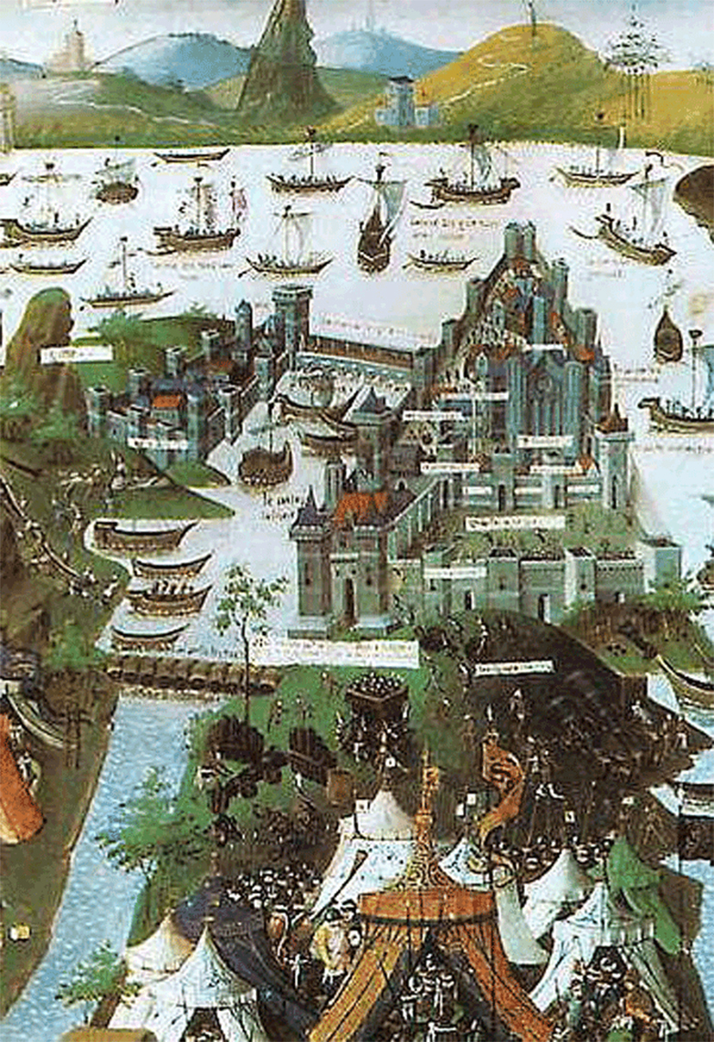 Η Βασιλεύουσα περιβαλλόταν από ξηράς με διπλό τείχος και τάφρο. Το τείχος αυτό, που επί 1000 χρόνια είχε βοηθήσει την Κωνσταντινούπολη να αποκρούσει νικηφόρα όλες τις επιθέσεις των εχθρών της, τώρα ήταν έρμαιο του πυροβολικού του σουλτάνου, που από τις 12 Απριλίου άρχισε καθημερινούς κανονιοβολισμούς.