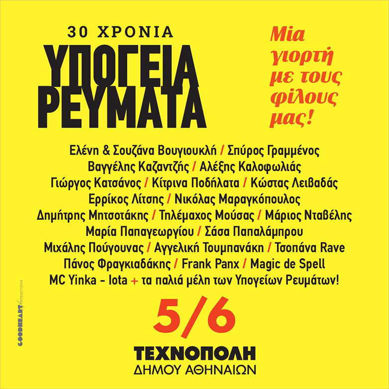 Τα Υπόγεια Ρεύματα κλείνουν τα 30 χρόνια και προσκαλούν όλες τις φίλες και τους φίλους τους σε μια μεγάλη συναυλία-γιορτή την Τετάρτη 5 Ιουνίου στην Τεχνόπολη Δήμου Αθηναίων.
