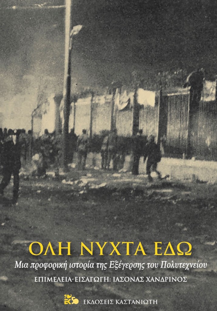 Μια προφορική ιστορία της Εξέγερσης του Πολυτεχνείου με ογδόντα τέσσερις (84) μαρτυρίες-συνεντεύξεις από ισάριθμους αφηγητές είναι το νέο βιβλίο του ιστορικού Ιάσονα Χανδρινού, επιστημονικού συνεργάτη του Πανεπιστημίου του Ρέγκενσμπουργκ στη Βαυαρία. Το βιβλίο «Όλη νύχτα εδώ Μια προφορική ιστορία της Εξέγερσης του Πολυτεχνείου» κυκλοφόρησε αυτές τις μέρες από τις εκδόσεις Καστανιώτη.