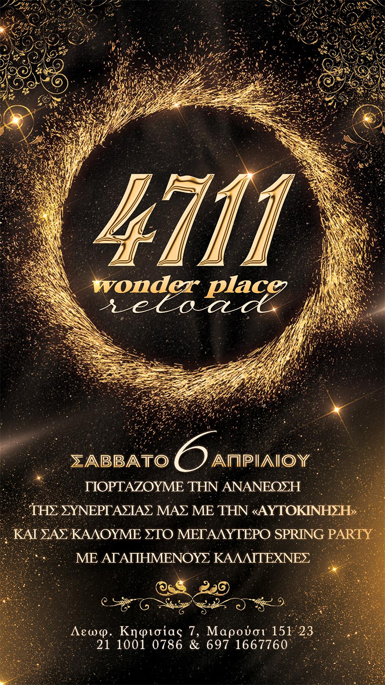 Το Σάββατο 6 Απριλίου, το 4711  Wonder place γιορτάζει  την ανανέωση της συνεργασίας του με την «Αυτοκίνηση» και μας καλεί στο μεγαλύτερο Spring Party με αγαπημένους καλλιτέχνες.