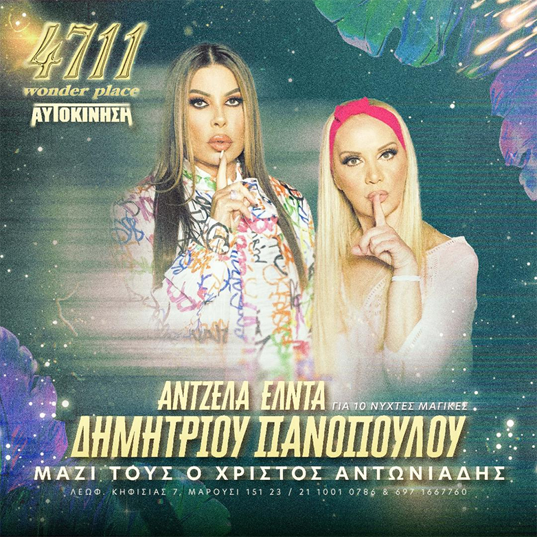 Νέα εποχή, καινούργια αρχή στο 4711 wonder place, με την Lady του ελληνικού τραγουδιού Άντζελα Δημητρίου να συναντιέται ξανά επί σκηνής με τη μοναδική Έλντα Πανοπούλου, από τις 17 Μαΐου και δέκα μοναδικές βραδιές κάθε Παρασκευή και Σάββατο.