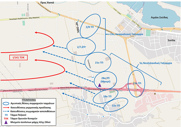 «Στις 27 Μαΐου 1941», όπως αναφέρει ο κ. Λόης, «το 28ο Τάγμα πρωτοστάτησε στη συγκλονιστική αναμέτρηση της 42ης Οδού (σημερινή οδός Τσικαλαριών), συμπαρασύροντας και τις γειτονικές Νεοζηλανδικές και Αυστραλιανές μονάδες. Απέναντι στην επιτιθέμενη εχθρική δύναμη, οι ενθουσιώδεις Μαορί στρατιώτες τοποθέτησαν με ψυχραιμία τις ξιφολόγχες στα τυφέκιά τους και διενέργησαν ορμητική έφοδο με απαράμιλλο θάρρος και με εκκωφαντικές ιαχές, διαλύοντας κυριολεκτικά τους Γερμανούς Ορεινούς Κυνηγούς. Μάλιστα, πριν την εφόρμηση, αρκετοί εξ’ αυτών σηκώθηκαν αγέρωχα από τις θέσεις μάχης τους και εκτέλεσαν τον πολεμικό χορό χάκα, κραδαίνοντας τον οπλισμό τους για λίγα δευτερόλεπτα, ενώ οι αντίπαλοί τους κοιτούσαν εμβρόντητοι. Αυτή η παροδική συμμαχική νίκη καθυστέρησε σημαντικά τη γερμανική προέλαση, παρέχοντας τον απαιτούμενο χρόνο στους σχηματισμούς της Βρετανικής Κοινοπολιτείας να αρχίσουν την απόσυρσή τους με σχετική ασφάλεια από την περιοχή της Σούδας προς τα νότια παράλια της Κρήτης».