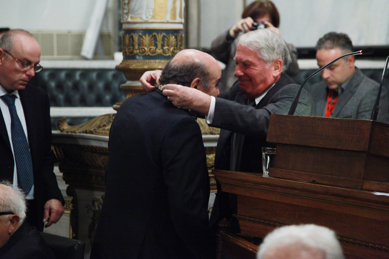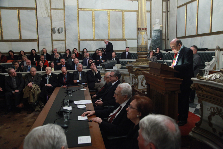 Στην ομιλία του ο νέος πρόεδρος, με σημείο εκκίνησης πραγματικές ή πλασματικές επιστολές σε μεγάλη αθηναϊκή εφημερίδα για τη σύγχρονη χρήση της νέας ελληνικής, τις «ελληνικούρες» στον δημόσιο λόγο και την άτυπη επαναφορά της καθαρεύουσας, διέτρεξε βασικούς σταθμούς και κρίσεις στην Ιστορία της γλώσσας μας, από τα Ευαγγελικά και τα αιματηρά Ορεστειακά των αρχών του 20ού αιώνα μέχρι την καθιέρωση της δημοτικής και τις σημερινές «κρίσεις», τις συζητήσεις για τη διδασκαλία των αρχαίων ελληνικών στα σχολεία και την επαναφορά της καθαρεύουσας. «Για τα περασμένα είμαστε ψύχραιμα κριτικοί, άλλωστε η ίδια η γλώσσα έχει αφαιρέσει τις αφορμές για τη μεγάλη διαμάχη» τόνισε λέγοντας ότι η γλώσσα μας περιλαμβάνει και τον Σολωμό και τον Μακρυγιάννη από τη μια και τον Κάλβο, τον Παπαδιαμάντη και τον Καβάφη από την άλλη.