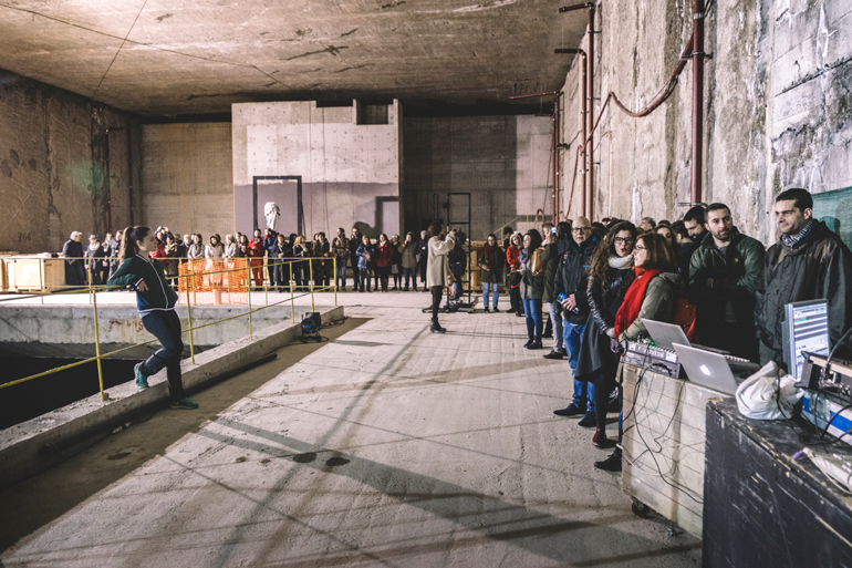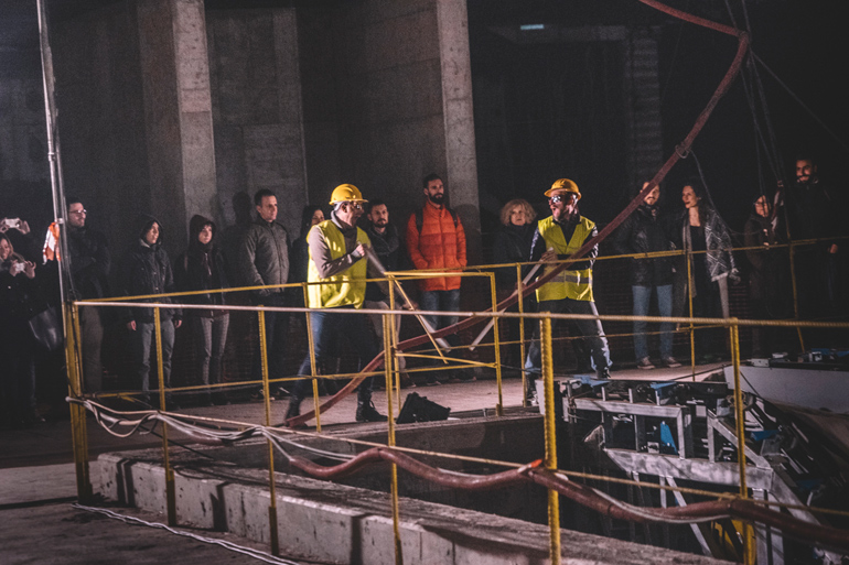 Οι θεατές που βρέθηκαν 8 μέτρα κάτω από την γη, έκαναν μια πρώτη διαδρομή με μουσική, χορό, ποίηση και φιλοσοφία. Στην performance ακούστηκαν αποσπάσματα του κομματιού «Η αλχημεία του λόγου» από τον δίσκο «Μια εποχή στην κόλαση» του Γιώργου Χριστιανάκη με τη φωνή της Λυδίας Φωτοπούλου.