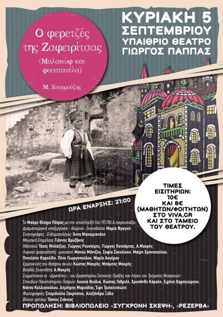 Από τη θεατρική παραγωγή ανακοινώνεται ότι η παράσταση «Ο φερετζές της Ζαφειρίτσας» ή «Μαλακώφ και φουστανέλα», που θα παρουσιαζόταν...