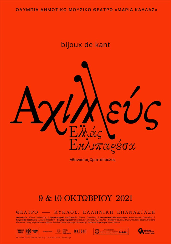 Το Ολύμπια Δημοτικό Μουσικό Θέατρο Μαρία Κάλλας του Οργανισμού Πολιτισμού, Αθλητισμού και Νεολαίας του Δήμου Αθηναίων (ΟΠΑΝΔΑ) ανοίγει ξανά την αυλαία του, το Σάββατο 9 και την Κυριακή 10 Οκτωβρίου, με την παράσταση «Αχιλλεύς. Ελλάς Εκλιπαρούσα» από τη θεατρική ομάδα bijoux de kant.