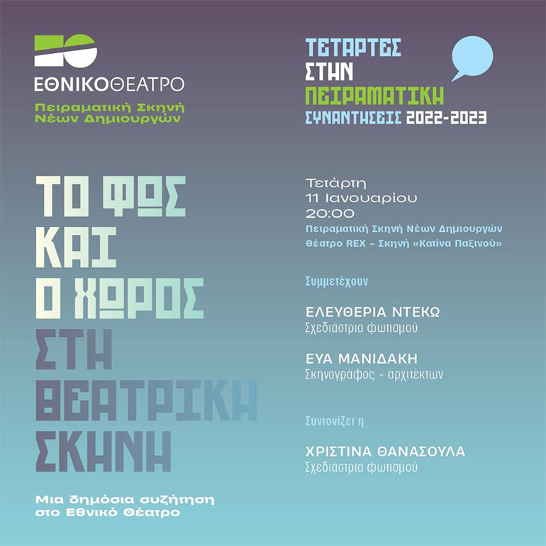 «Το φως και ο χώρος στη θεατρική σκηνή» είναι το θέμα της δημόσιας συζήτησης που διοργανώνει το Εθνικό Θέατρο, την Τετάρτη 11 Ιανουαρίου στις 20.00, στο Θέατρο Rex – Σκηνή «Κατίνα Παξινού».Πρόκειται για την δεύτερη συνάντηση στην Πειραματική Σκηνή Νέων Δημιουργών, μέσω της οποίας έχει ξεκινήσει μια σειρά συζητήσεων με καταξιωμένους καλλιτέχνες που συμμετέχουν στη δημιουργία μιας παράστασης.
