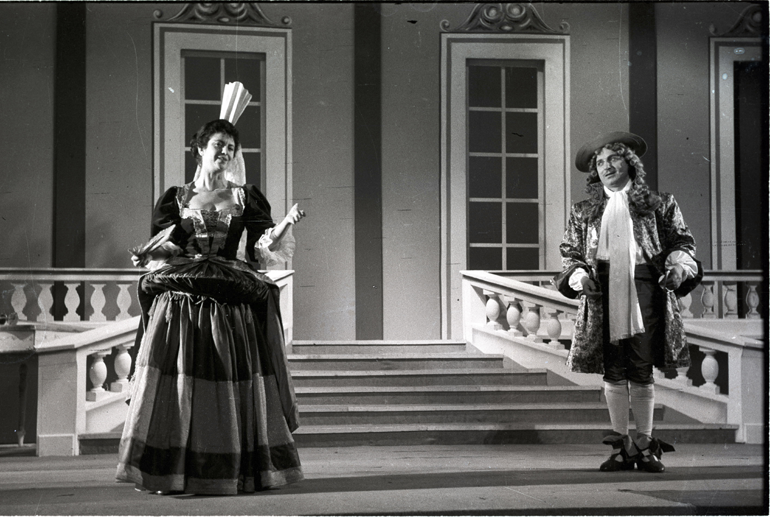 Η Κλειώ Νικολάου και ο Ηλίας Σταματίου στην παράσταση του έργου του Μολιέρου Ο αρχοντοχωριάτης (Σκηνοθεσία: Σωκράτης Καραντινός. Κοστούμια: Νίκος Εγγονόπουλος), ΚΘΒΕ 1962.