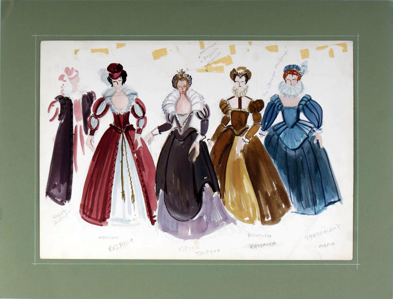 Ζωγραφικές μακέτες κοστουμιών της Ρένας Γεωργιάδου για την παράσταση του έργου του Ουίλλιαμ Σαίξπηρ Αγάπης αγώνας άγονος (Σκηνοθεσία: Κανέλλος Αποστόλου), ΚΘΒΕ 1983.