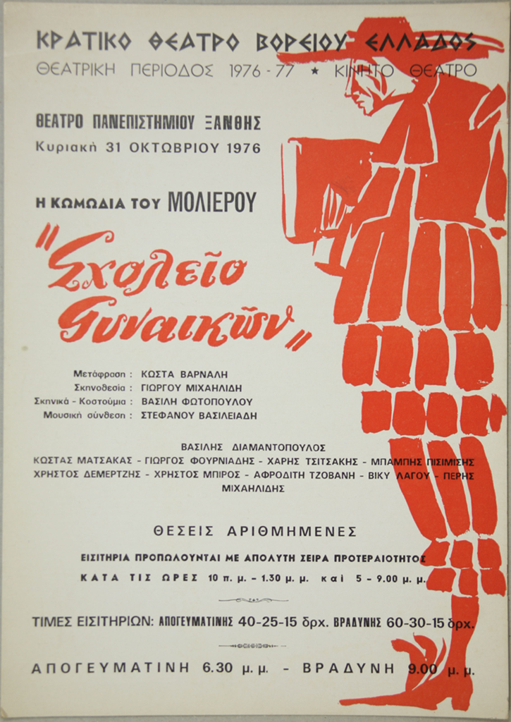 Ζωγραφική μακέτα κοστουμιού του Βασίλη Φωτόπουλου στην αφίσα της παράστασης Σχολείο γυναικών (Σκηνοθεσία: Γιώργος Μιχαηλίδης), ΚΘΒΕ 1976.
