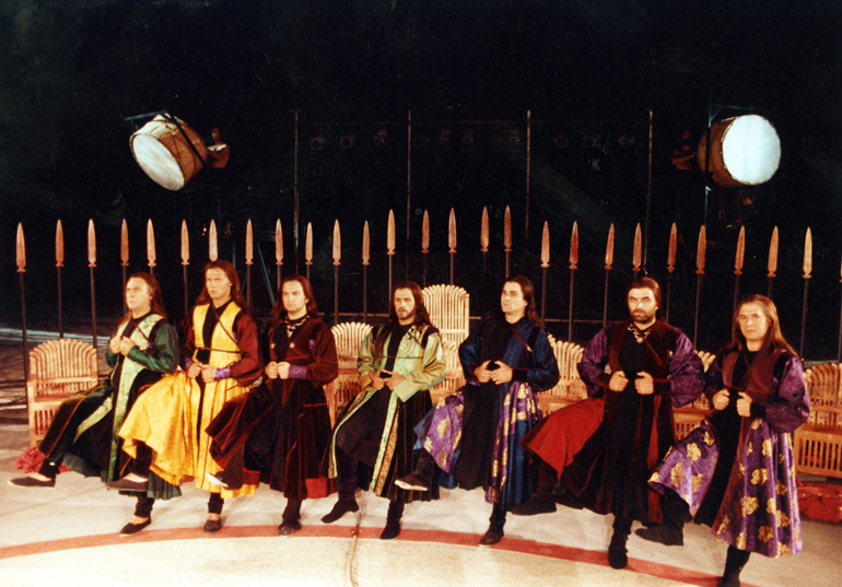 Οι Επτά Κατάσκοποι στην παράσταση του έργου του Αισχύλoυ Επτά επί Θήβας (Σκηνοθεσία: Σταύρος Τσακίρης. Κοστούμια: Ιωάννα Παπαντωνίου), ΚΘΒΕ 1993.