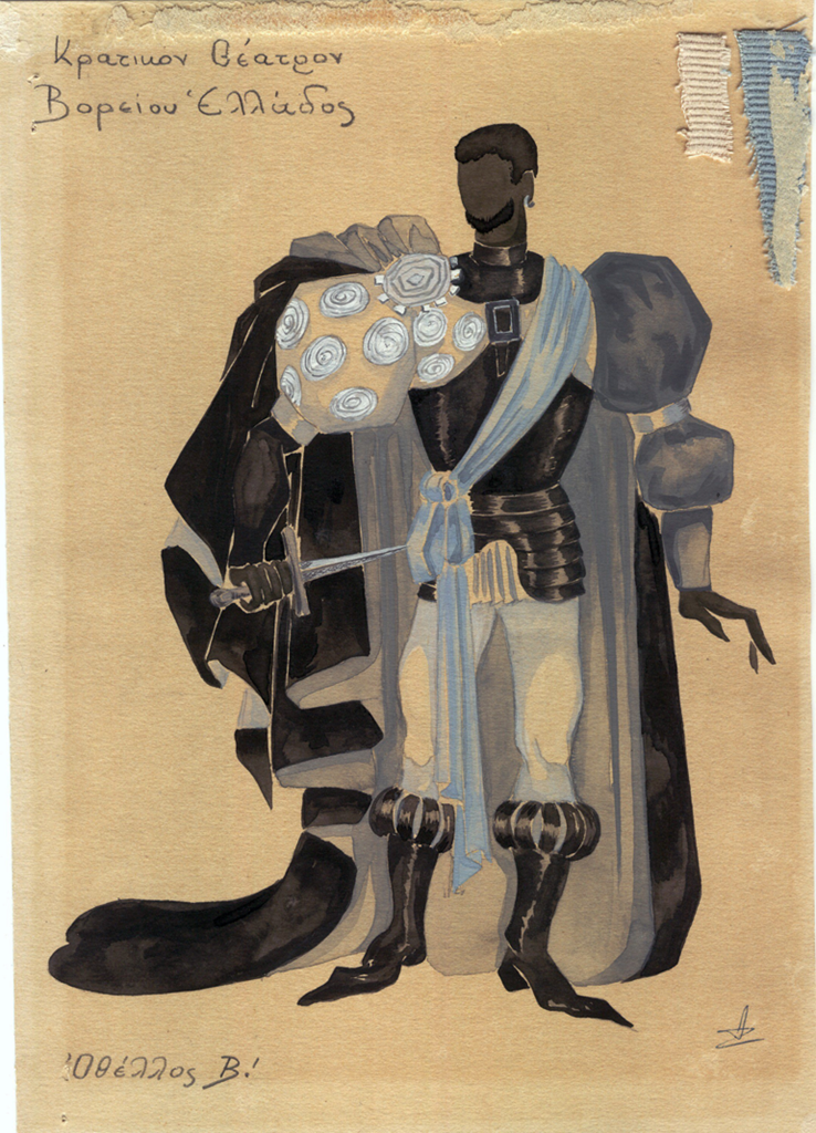 Ζωγραφική μακέτα κοστουμιού της Λίζας Ζαΐμη για την παράσταση του έργου του Ουίλλιαμ Σαίξπηρ Οθέλλος (Σκηνοθεσία: Σωκράτης Καραντινός), ΚΘΒΕ 1964.