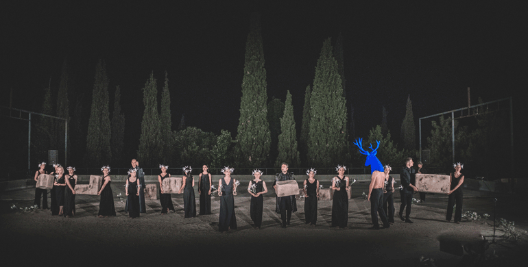 Τον συναντήσαμε στο Θέατρο Δάσους, στη διάρκεια των προβών. Στο «άδειο» σκηνικό (στρατόπεδο των Ελλήνων στην παραλία της Αυλίδας -νύχτα καλοκαιριού- ένα λυχνάρι φωτίζει τη βασιλική σκηνή, σύμφωνα με τις προλογικές «οδηγίες» του ποιητή), άμμος, θραύσματα αρχαίων μαρμάρων (σκηνικά και κοστούμια Αλεξάνδρας Μπουσουλέγκα, Ράνιας Υφαντίδου), χορός γυναικών με μαύρες τουαλέτες, η Κλυται-Μήστρα κατά τον αρχικό τύπο (κι όχι Κληταιμνήστρα) που ερμηνεύει η Μαρία Τσιμά, η Ιφιγένεια (η βραβευμένη Ανθή Ευστρατιάδου) -επίσης μαυροφορεμένη αν και …νύφη (του Άδη;), κρινάκια της θάλασσας, και ο αγγελιοφόρος – ιερό ελάφι της Αρτέμιδας (όχι με …χρυσά, αλλά και βαθύ μπλε κέρατα και προσωπείο που φορά για να το ερμηνεύει περιπλανώμενο επί σκηνής και ..ιστορίας ο Χρίστος Στυλιανού, μικρόφωνα σε ορθοστάτη που «αρπάζουν», για να ακουστούν ως …ροκ σταρ οι κορυφαίες του χορού, εξαιρετικά υποβλητικό και …επαναλαμβανόμενο το μουσικό θέμα ( του Θοδωρή Οικονόμου) κι ο λόγος του Ευριπίδη -βαθειά ειρωνικός – σαρκαστικός στις έννοιες του ηρωισμού, των πατριαρχικών αξιών… Ανάλογος κι αυτός της μετάφρασης του στα καθ’ ημάς του Παντελή Μπουκάλα: «Θνητός κανένας ευτυχής μέχρι το τέλος. Απίκραντος άνθρωπος δε γεννήθηκε ακόμη…».