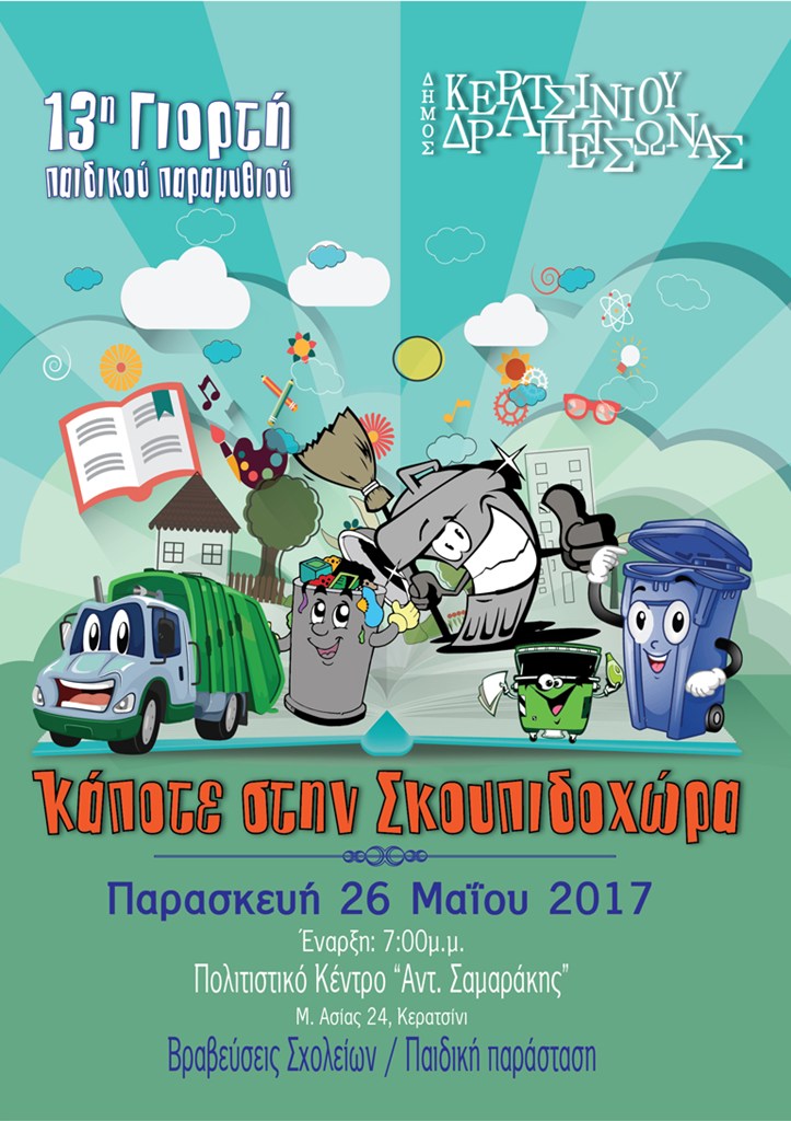 Ο Δήμος Κερατσινίου – Δραπετσώνας διοργανώνει για 13η συνεχή χρονιά τη «Γιορτή του παιδικού παραμυθιού», την Παρασκευή 26 Μαΐου, στις 7 μ.μ. στο Πολιτιστικό Κέντρο «Αντώνης Σαμαράκης» (Μ. Ασίας 24, Κερατσίνι).
