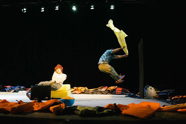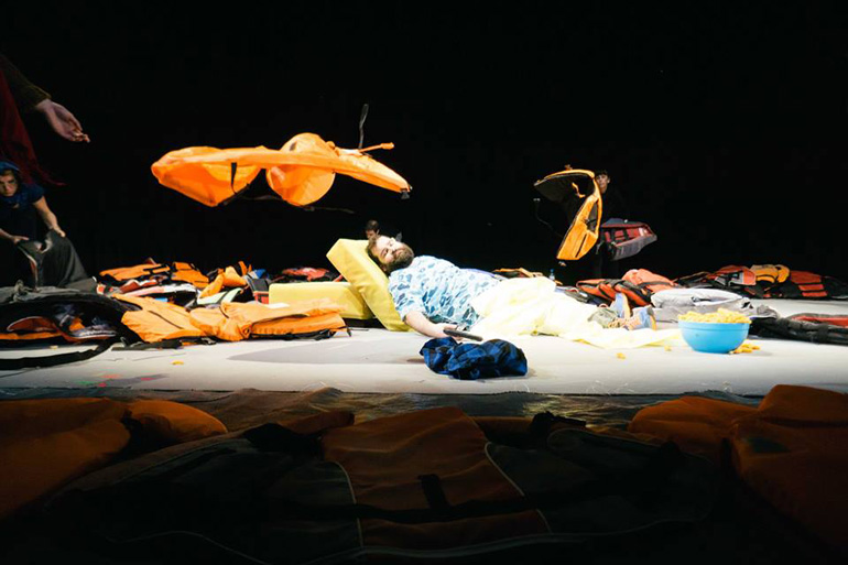 Στην παράσταση το διαμέρισμα της Απειλής τοποθετείται στο κέντρο μιας δυστοπίας: ένα καθιστικό, περικυκλωμένο από μια αφιλόξενη παραλία. Όμως, το ναυάγιο συμβαίνει μέσα στο διαμέρισμα. Ο Δήμος Μυτιλήνης παραχώρησε ειδικά για τις ανάγκες αυτής της παράστασης εκατόν ογδόντα σωσίβια που έφεραν μαζί τους πρόσφυγες από τη Συρία οι οποίοι τους τελευταίους μήνες πέρασαν τη θάλασσα για να σωθούν. Τα σωσίβια αυτά, ένα τεκμήριο της οδύνης του εξόριστου σώματος του «ξένου», μετατρέπονται σε τοίχους του διαμερίσματος του ζευγαριού,