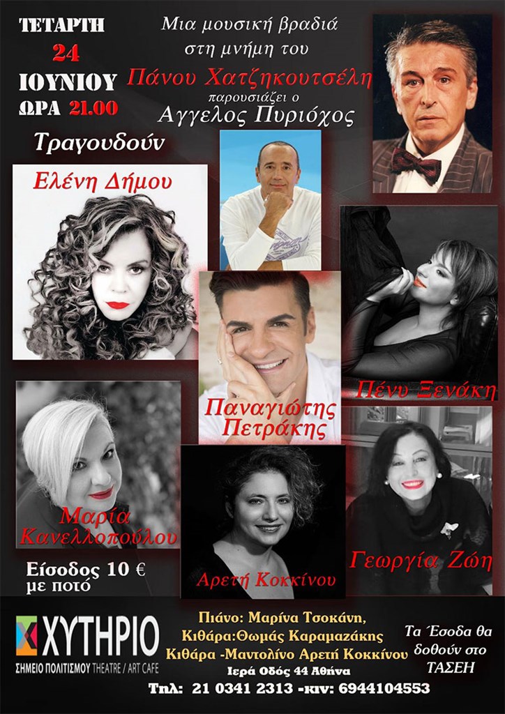 Την Τετάρτη 24 Ιουνίου στις 21:00 στο θέατρο Χυτήριο θα πραγματοποιηθεί μια βραδιά αφιερωμένη στο Πάνο Χατζηκουτσέλη.