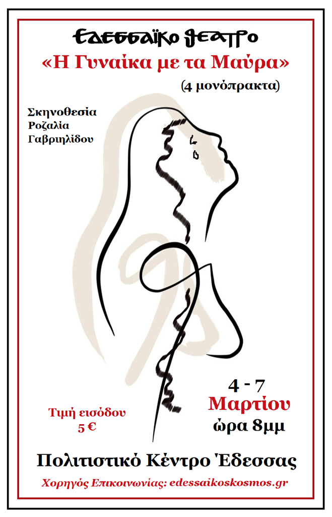 Τέσσερα μονόπρακτα, υπό τον γενικό τίτλο «Η Γυναίκα με τα Μαύρα», ανεβάζει από τις 4 ως τις 7 Μαρτίου το Εδεσσαϊκό Θέατρο, που πραγματοποιεί πολύ συχνά ιδιαίτερα αξιόλογες παραστάσεις στην πόλη. Μάλιστα το τέταρτο και τελευταίο μονόπρακτο, είναι αφιερωμένο στις στις 17 γυναίκες που έχασαν τη ζωή τους το 2021 από τα χέρια αντρών που ισχυρίστηκαν πως τις αγαπούσαν.