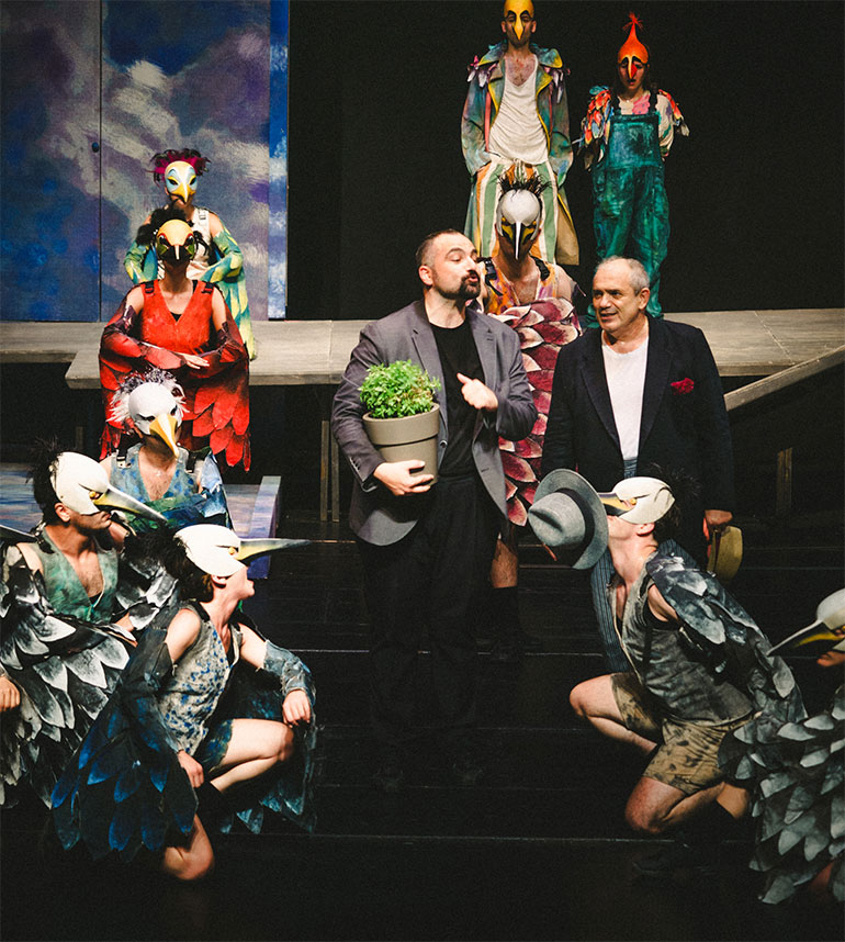 Οι εμβληματικοί «Όρνιθες» του Αριστοφάνη, σε σκηνοθεσία Γιάννη Ρήγα, επέστρεψαν για 2η χρονιά, μετά τις διθυραμβικές κριτικές που απέσπασαν πέρσι στο Αρχαίο Θέατρο της Επιδαύρου, στην περιοδεία αλλά και στα Φεστιβάλ Δάσους, Δίου και Φιλίππων. Σ’ ένα νέο ταξίδι ψυχής, με αφετηρία το Θέατρο Δάσους, τα «πουλιά» πέταξαν ψηλά στον ουρανό της Θεσσαλονίκης, απογειώνοντας το θεατρόφιλο κοινό στην Αριστοφανική «Νεφελοκοκκυγία», στην πρεμιέρα της μεγάλης καλοκαιρινής παραγωγής του ΚΘΒΕ που δόθηκε την Παρασκευή 16 Ιουλίου.