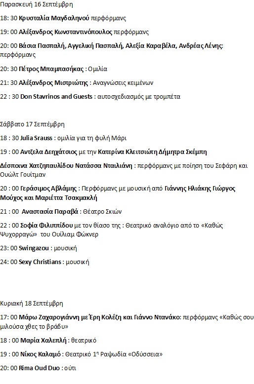 Οι συμμετέχοντες θα παρουσιάσουν θεατρικά εικαστικά και μουσικά έργα όπως και περφόρμανς. Το Σάββατο η βραδιά θα κλείσει με την ενθουσιώδη μπάντα Sexy Christians. Την Κυριακή θα μας πλανέψουν με τα ούτια τους οι Rima Oud Duo. Συμμετέχουν οι Αλέξανδρος Μιστριώτης με αναγνώσεις κειμένων, Η Αντζελα Δελιχάτσιου με την ομάδα της παρουσιάζουν ένα θεατρικό αναλόγιο με ποίηση του Σεφέρη, ο Νίκος Καλαμό θα μας παρουσιάσει την πρώτη Ραψωδία της Οδύσσειας, Κρυσταλία Μαγδαληνού περφόρμανς, Ιάνθη Αγγελίογλου, περφόρμανς, η Αναστασία Παράβα μια νέα ματιά στο θέατρο σκιών, η Κατερίνα Αντωνάκη, ο Lee Wells η Ραπανάκη Ελεύθερία, Αθηνά Κανελοπούλου, Βάσω Πουρίδου, Κάτια Καρβέλη, στα εικαστικά, ο Αντώνης Σταυρινός πειραματίζεται με την τρομπέτα του, η Bojana Popadic θα μας μυήσει στον χορό του Butoh.κ.α.