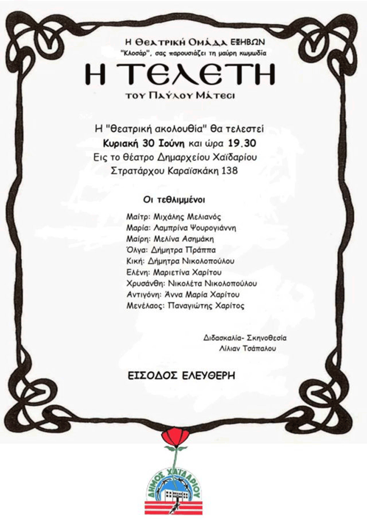 Η Θεατρική Ομάδα Εφήβων «Κλοσάρ» παρουσιάζει τη μαύρη κωμωδία «Η τελετή» την Κυριακή 30 Ιουνίου στις 7:30 μμ στην Αίθουσα Εκδηλώσεων Δημαρχείου Χαϊδαρίου.
