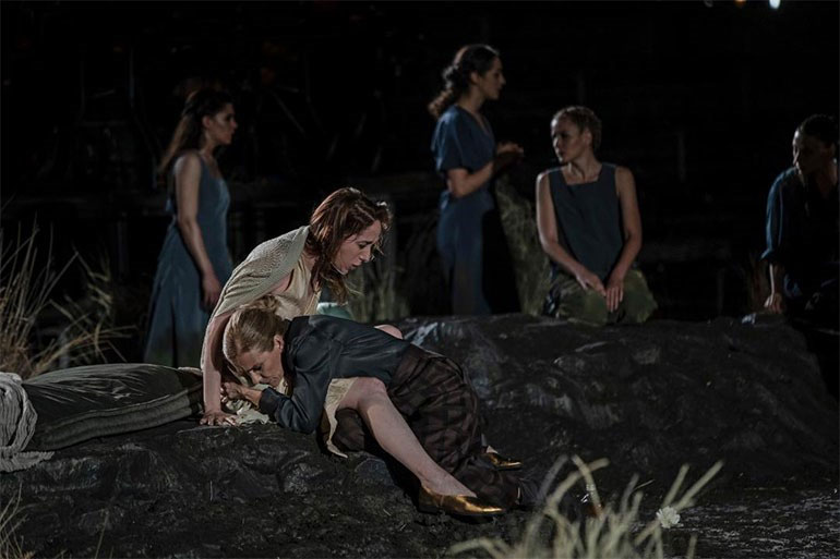 Το σκηνικό της παράστασης, ένα βαλτώδες δυστοπικό τοπίο με αγρωστώδη φυτά και νερό, αντανακλά την ερημιά της ανθρώπινης ύπαρξης. Στην παράσταση η Αφροδίτη κρατώντας μία κάμερα, και μέσα σε υποβλητική μουσική, κινηματογραφεί και αναμεταδίδει ζωντανά σε μονοπλάνο όλη τη δράση, παρουσιάζοντας χωρίς μοντάζ στο κοινό πτυχές και λεπτομέρειές της. Ο θίασος κινείται σε όλη την έκταση του αρχαίου θεάτρου, μέσα, γύρω και πίσω από την ορχήστρα, ανάμεσα στο όνειρο και την πραγματικότητα, ιχνηλατώντας τη μετ’ εμποδίων διαδρομή ανάμεσα στην αγνότητα και τη λαγνεία, στην άγνοια και τη γνώση, ανάμεσα στην ίδια την πτώση του ανθρώπου και την εξιλέωσή του.