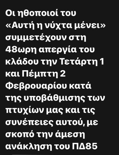 Προχωράμε κανονικά, ακόμα πιο δυναμικά και πιο πεισμωμένοι στην 48ωρη απεργία μας αύριο Τετάρτη 1/2 και μεθαύριο Πέμπτη 2/2, στην οποία συμμετέχει και η Πανελλήνια Ομοσπονδία Καλλιτεχνικού Προσωπικού ΟΤΑ (ΠΟΚΠ-ΟΤΑ), καθώς και Πανελλήνια Ομοσπονδία Εργαζομένων Οργανισμών Τοπικής Αυτοδιοίκησης (ΠΟΕ-ΟΤΑ). Συγκέντρωση την Πέμπτη 2/2 στις 12:00 στο Σύνταγμα για την Αθήνα και την ίδια ώρα στο Άγαλμα του Ελευθέριου Βενιζέλου στη Θεσσαλονίκη.
