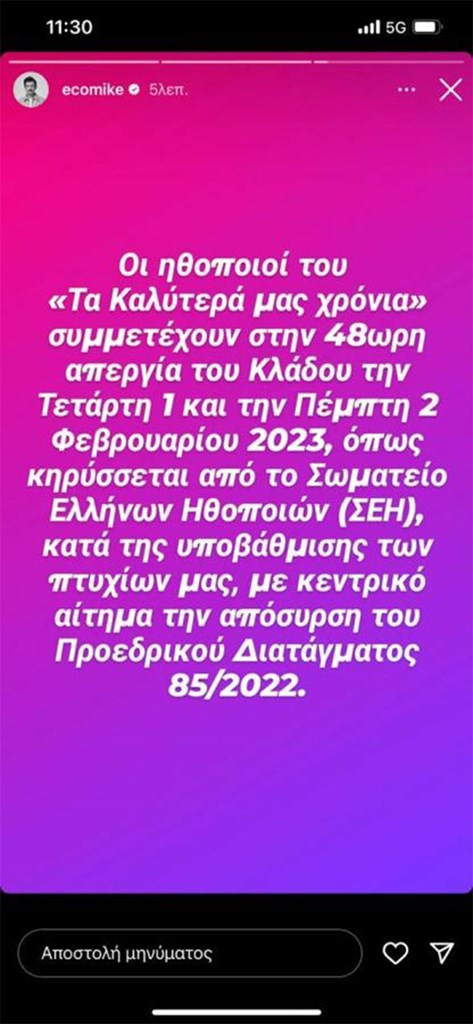 «Σήμερα Τρίτη 31/1 η κυβέρνηση έφερε την τροπολογία που είχε εξαγγείλει το Σάββατο ο Πρωθυπουργός κ. Μητσοτάκης με δημοσίευση στα μέσα κοινωνικής δικτύωσης. Η τροπολογία αυτή όχι μόνο δεν θεραπεύει τα προβλήματα που δημιουργεί το ΠΔ 85/2022, αλλά καταργεί και τα εναπομείναντα δικαιώματα των καλλιτεχνών. Αναφέρει ότι οι κάθε είδους αμοιβές των καλλιτεχνών σε ΟΤΑ και ΝΠΙΔ καθορίζονται με κοινές υπουργικές αποφάσεις των υπουργών Οικονομικών, Πολιτισμού και Εσωτερικών και του κατά περίπτωση άλλου συναρμόδιου Υπουργού. Αυτό σημαίνει ότι πλέον οι αμοιβές των καλλιτεχνών στον ευρύτερο Δημόσιο Τομέα και στα Νομικά Πρόσωπα Ιδιωτικού Δικαίου δεν θα καθορίζονται από Συλλογικές Συμβάσεις Εργασίας, αλλά από την εκάστοτε κυβέρνηση. Πρόκειται για μία ευθεία επίθεση στα εργασιακά μας δικαιώματα, ενώ ανοίγει ταυτόχρονα την πόρτα ώστε να εφαρμοστεί αυτό το μοντέλο και σε άλλους τομείς.