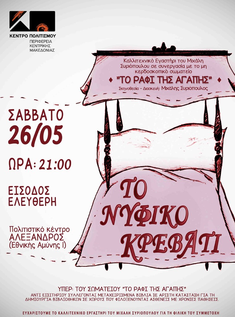 Τη θεατρική παράσταση «Νυφικό Κρεβάτι» του Ολλανδού συγγραφέα Jan de Hartog διοργανώνει το Κέντρο Πολιτισμού της Περιφέρειας Κεντρικής Μακεδονίας, το Σάββατο 26 Μαΐου 2018 στο Πολιτιστικό Κέντρο «Αλέξανδρος» (Εθνικής Αμύνης 1).