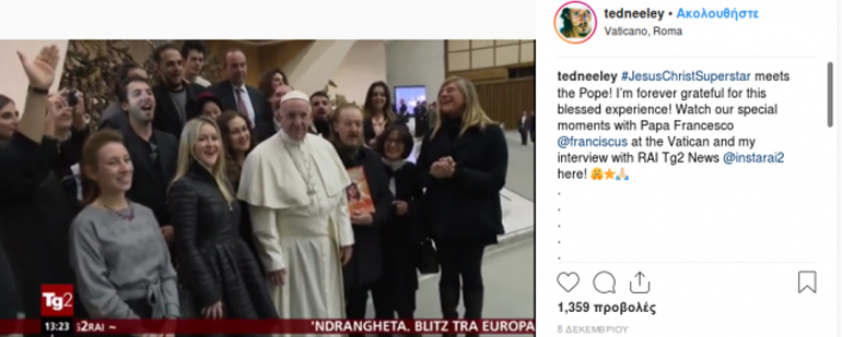 Ο ηθοποιός στις αρχές του μήνα τουίταρε στον προσωπικό του λογαριασμό: «#JesusChristSuperstar συναντά τον Πάπα! Είμαι για πάντα ευγνώμων γι αυτή την ευλογημένη εμπειρία! Παρακολουθήστε τη συνάντησή μας με τον πάπα Φραγκίσκο στο Βατικανό».