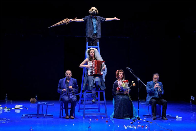 Οι πέντε ερμηνευτές-ηθοποιοί αναλαμβάνουν τη σκηνική αφήγηση λειτουργώντας ως «χορός», από τον οποίο προκύπτουν τα βασικά πρόσωπα του διηγήματος, ενώ η μουσική συνομιλεί με την πλούσια επτανησιακή μουσική παράδοση μέσα από μια σύγχρονη μουσική εκφορά.