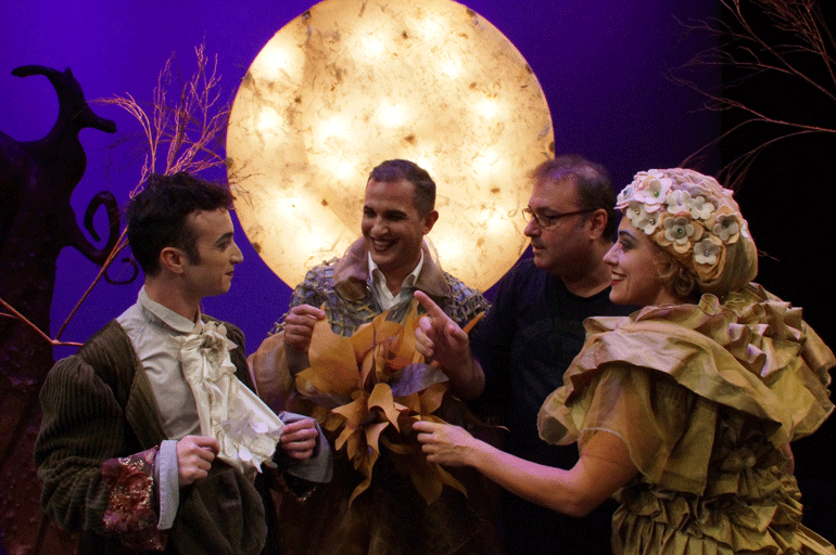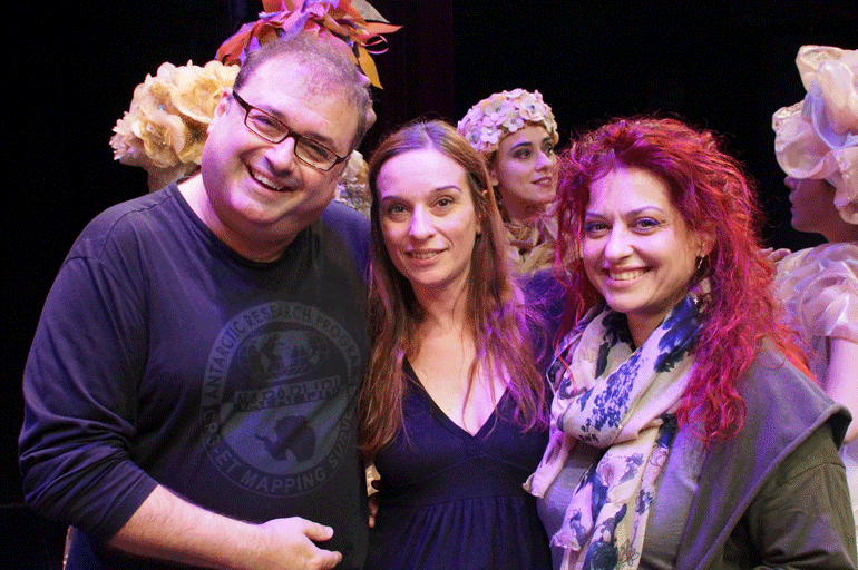 Ο σκηνοθέτης Δημήτρης Αδάμης με την ενδυματολόγο Ελίνα Δράκου και την Ιφιγένεια Κουφού που κατασκεύασε καπέλα και μάσκες.