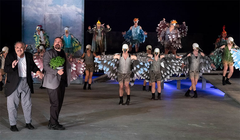 Η πρεμιέρα των Αριστοφανικών «Ορνίθων» -της συμμετοχής του Κρατικού Θεάτρου Βορείου Ελλάδος (ΚΘΒΕ) στο ιδιότυπο εφετινό θεατρικό καλοκαίρι- δόθηκε χθες το βράδυ στο Θέατρο Δάσους… Κι ήταν όλοι εκεί. Πολίτες-θεατές στην «πλατεία» (ειδικά στο κάτω διάζωμα και τις πρώτες κερκίδες του), πολιτικές και ιδεολογικές ουτοπίες στη σκηνή, σύγχρονες δυστοπίες, μάσκες (χειρουργικές και πάνινες για τους θεατές, μάσκες -ράμφη για τους ηθοποιούς) πολύχρωμα φτερά για τους τσαλαπετεινούς και τις κάριες και τους κορυδαλλούς , και τα περιστέρια του χορού των πουλιών αλλά και… δύο (μάλλον άσχημες) ογκώδεις σφαίρες με ακίδες γύρω τους (το εργαστηριακό σχήμα του …κορωνοϊού).