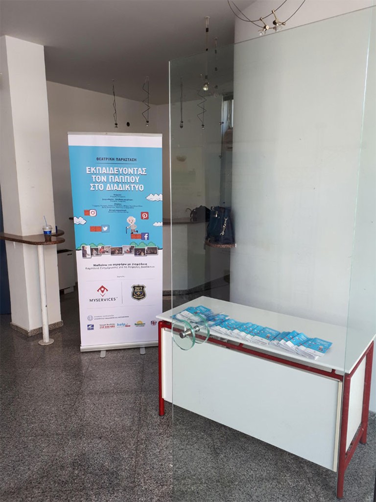 Στο πλαίσιο της εκδήλωσης παρουσιάστηκε θεατρική παράσταση με τίτλο: «Εκπαιδεύοντας τον παππού στο διαδίκτυο», ενώ συντονιστής της συζήτησης ήταν ο κ. Γιώργος Κορμάς, Υπεύθυνος Γραμμής Βοήθειας Ελληνικού Κέντρου Ασφαλούς Διαδικτύου και επιστημονικός υπεύθυνος των ΚΕΠ ΥΓΕΙΑΣ.