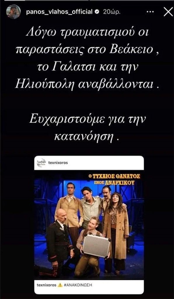 «Λόγω τραυματισμού οι παραστάσεις στο Βεάκειο, το Γαλάτσι και την Ηλιούπολη αναβάλλονται. Ευχαριστούμε για την κατανόηση», έγραψε χαρακτηριστικά ο Πάνος Βλάχος.