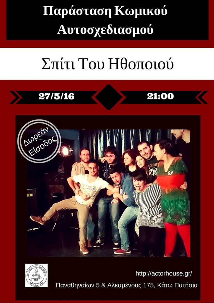 Την Παρασκευή 27 Μαΐου 2016 ερχόμαστε να πραγματοποιήσουμε μια μοναδική παράσταση θεατρικού αυτοσχεδιασμού improv comedy στο Ίδρυμα Το Σπίτι του Ηθοποιού!