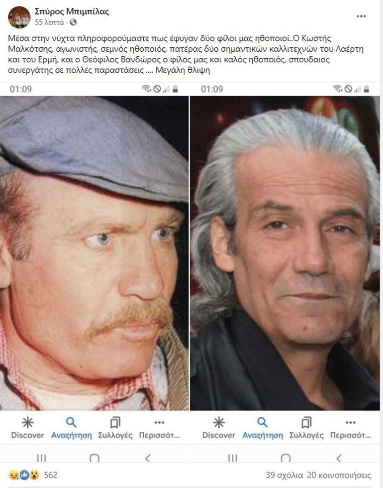 Ο Σπύρος Μπιμπίλας έγραψε στο facebook: «Μέσα στη νύχτα πληροφορούμαστε πως έφυγαν δύο φίλοι μας ηθοποιοί..Ο Κωστής Μαλκότσης, αγωνιστής, σεμνός ηθοποιός, πατέρας δύο σημαντικών καλλιτεχνών του Λαέρτη και του Ερμή, και ο Θεόφιλος Βανδώρος ο φίλος μας και καλός ηθοποιός, σπουδαίος συνεργάτης σε πολλές παραστάσεις ….Μεγάλη θλιψη!»
