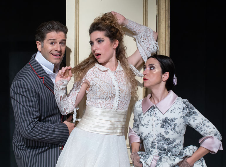 Το σκηνικό αυτό «πολυεργαλείο» χρησιμοποιείται με ευφάνταστους τρόπους για να μετατραπεί τελικά σε έναν άλλου είδους καθρέφτη που αντανακλά ξεκαρδιστικά τη ψυχική διάθεση των ηρώων.