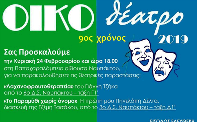 Αυτήν την Κυριακή, 24 Φεβρουαρίου και ώρα 18:00, στην Παπαχαραλάμπειο αίθουσα Ναυπάκτου, θα «ανέβουν» οι παραστάσεις «Λαχανοφρουτοθεραπεία» από το 6ο Δημοτικό Σχολείο Ναυπάκτου και το «Παραμύθι χωρίς όνομα» από το 3ο Δημοτικό Σχολείο Ναυπάκτου.