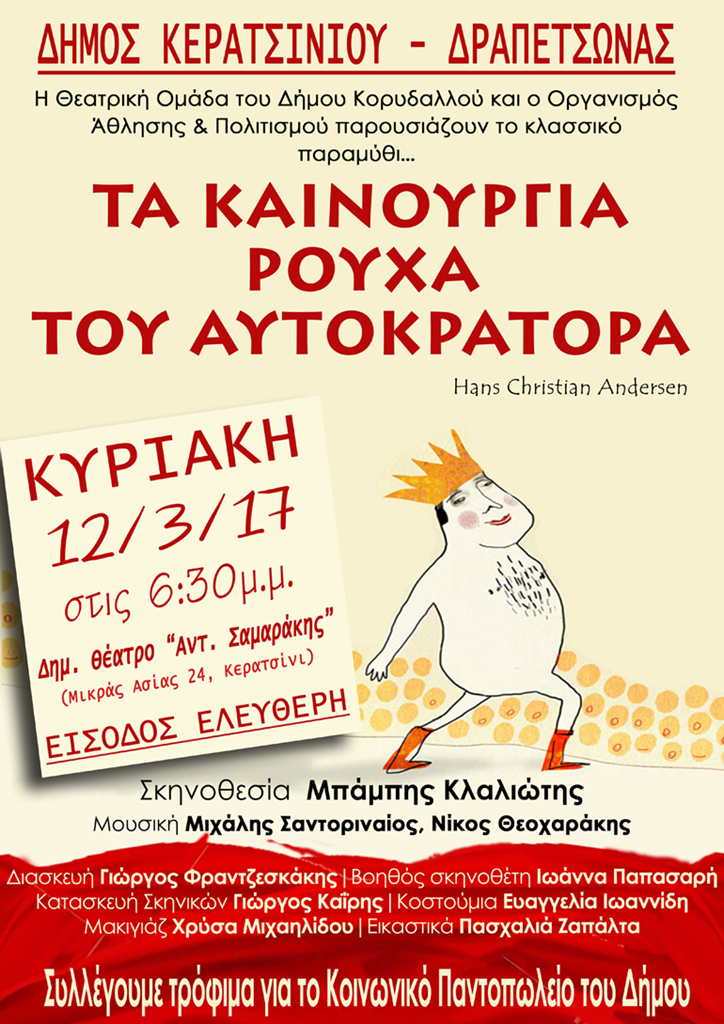 Ο Δήμος Κερατσινίου – Δραπετσώνας με τη Θεατρική Ομάδα του Δήμου Κορυδαλλού και τον Οργανισμό Άθλησης και Πολιτισμού παρουσιάζουν το κλασσικό παραμύθι «Τα καινούργια ρούχα του αυτοκράτορα», την Κυριακή 12 Μαρτίου στις 6.30 μ.μ. στο πολιτιστικό κέντρο «Αντώνης Σαμαράκης» (Μικράς Ασίας 24, Κερατσίνι).