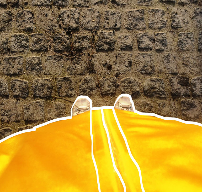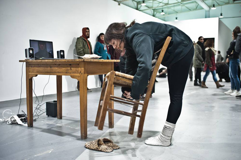 Προσπαθεί χαμαιλεοντικά να γίνει ένα με το περιβάλλον της, να εξαφανιστεί μέσα στα χρώματα του γυαλιστερού της φόντου. Αφού ολοκληρώσει την κατασκευή του προσωπείου της η περφόρμερ θα συνεχίσει το έργο στους δρόμους γύρω από το Performance Shop, όπου καλούμαστε να την ακολουθήσουμε.