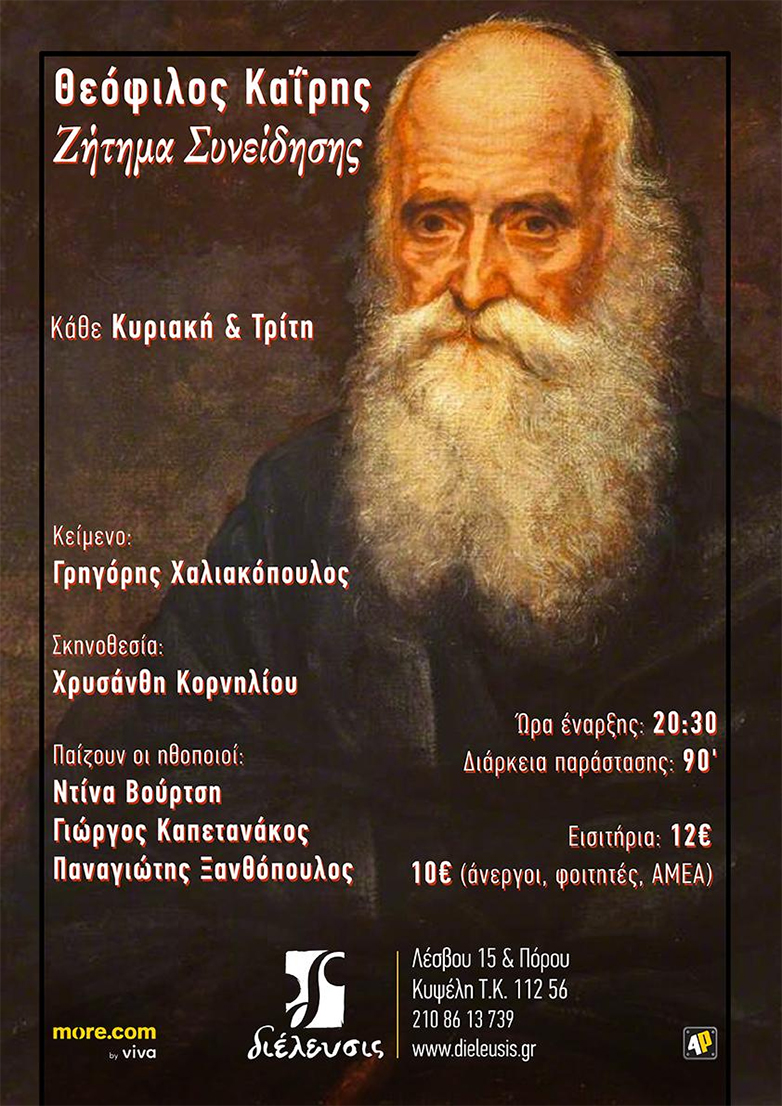 Στον Πολυχώρο Πολιτισμού Διέλευσις παρουσιάζεται από την Κυριακή 19 Νοεμβρίου 2023 και κάθε Κυριακή και Τρίτη στις 20:30, το έργο «Θεόφιλος Καΐρης – Ζήτημα συνείδησης» σε κείμενο του Γρηγόρη Χαλιακόπουλου και σκηνοθεσία της Χρυσάνθης Κορνηλίου.