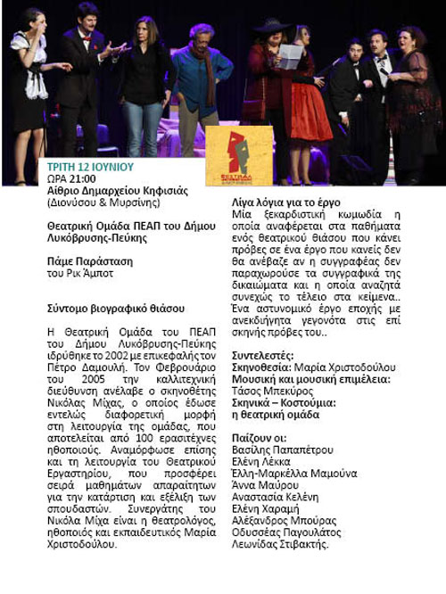 Τρίτη 12 Ιουνίου, ώρα 21:00: «Πάμε παράσταση» του Ρικ Άμποτ από τη Θεατρική Ομάδα ΠΕΑΠ του Δήμου Λυκόβρυσης – Πεύκης, σε σκηνοθεσία Μαρίας Χριστοδούλου.